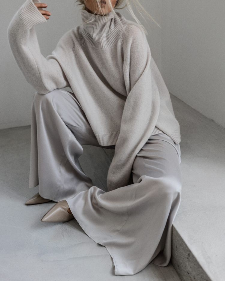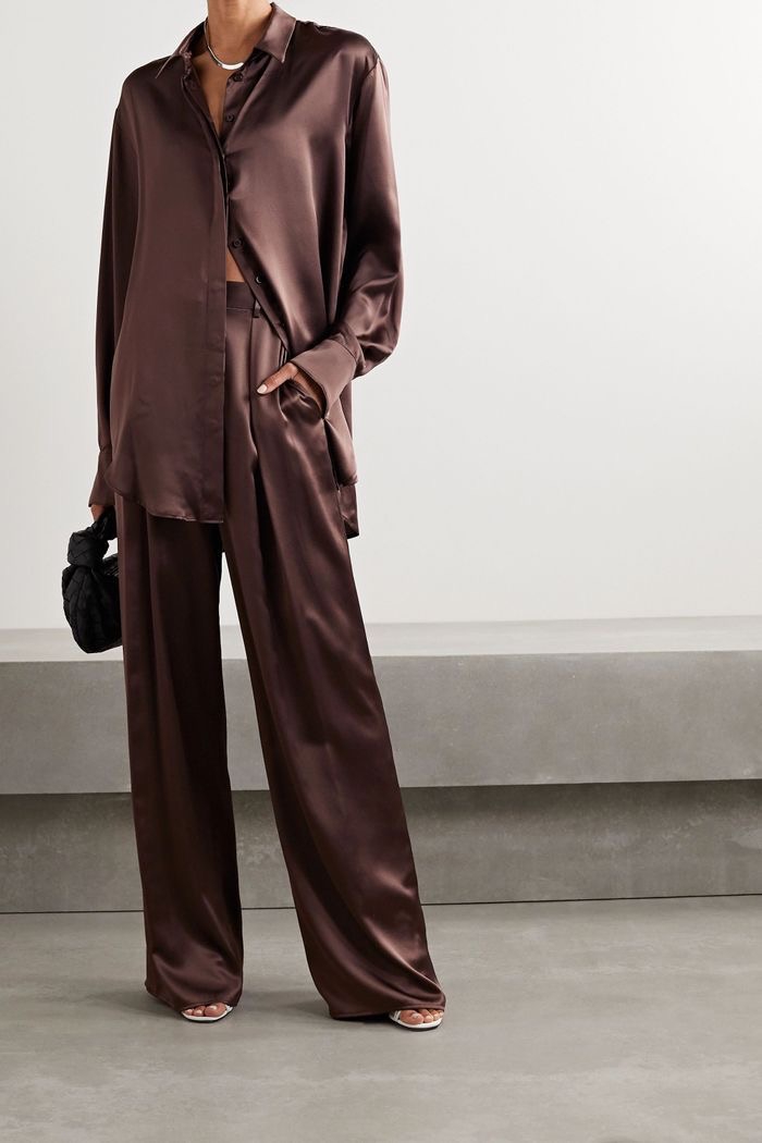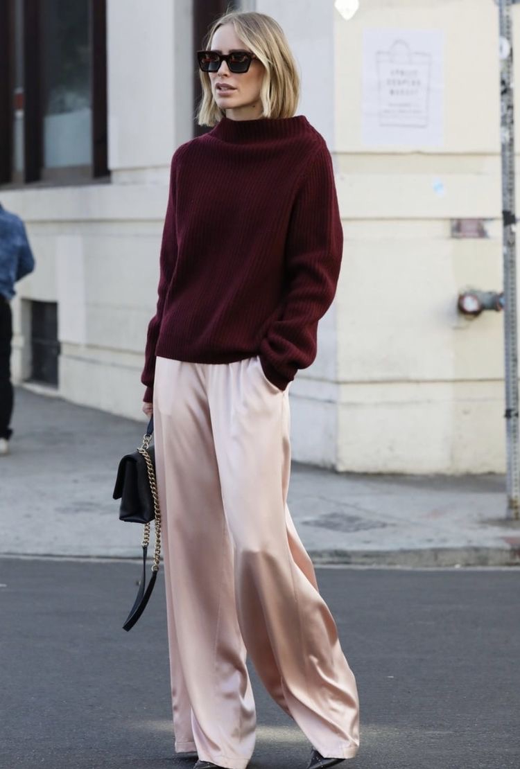 Предлагаю компромисс. Я бы рассмотрел вариант скомбинировать эти два варианта, подобрав вещи так, чтобы в дальнейшем использовать в гардеробе. Лучшим решением может быть покупка комплекта из двух вещей — сейчас в магазинах представлен достаточно обширный ассортимент таких костюмов. К примеру, вы покупаете шелковые брюки и рубашку (в пижамном стиле) . Дополняете их яркими или блестящими аксессуарами, желательно крупными, ведь это большой тренд, и тем самым создаете новогодний образ. В дальнейшем вы можете смело разбить этот лук и применять к повседневной жизни. Например, сочетая шелковые брюки со свитером или объемной толстовкой и кроссовками. Толстовка создаст баланс, уравнивая легкость и «вечернее настроение» брюк. Также можно и поступить с рубашкой, добавив к ней черные прямые или широки брюки, которые есть практически у каждой девушки. Джинсы также можно включить в игру. Под рубашку можно надеть обычную футболку, тем самым еще сильнее снизив градус нарядности образа.